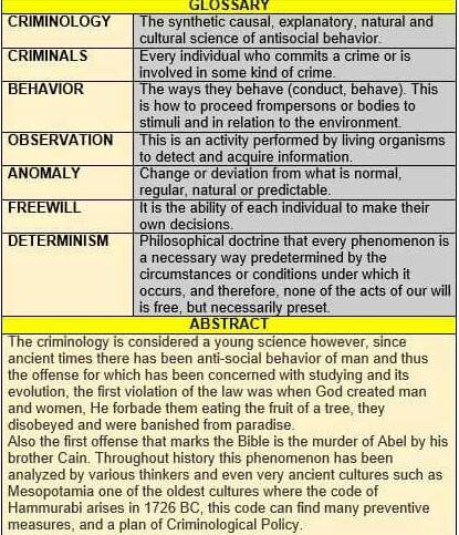 La criminología es considerada como una ciencia joven sin embargo desde tiempos remotos ha existido conductas antisociales del hombre y con ello el delito por lo cual se ha tenido la preocupación de estudiarlas así como su evolución , la primera violación a la ley fue cuando dios creo al hombre y le dio a la mujer, les prohibió comer del fruto de un árbol a lo cual desobedecieron y fueron desterrados del paraíso desde ese momento podemos identificar la acción que se cometió y la sanción a la cual fueron acreedores. Así mismo el primer delito que nos marca la biblia es el asesinato de Abel por su hermano Caín.